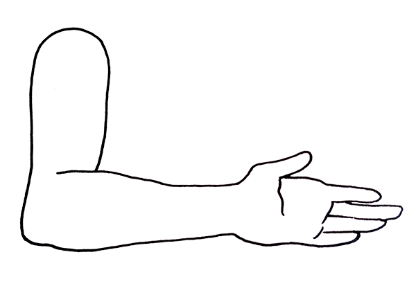An arm with the hand pointing out, the distance from elbow to fingertip is about eighteen inches.