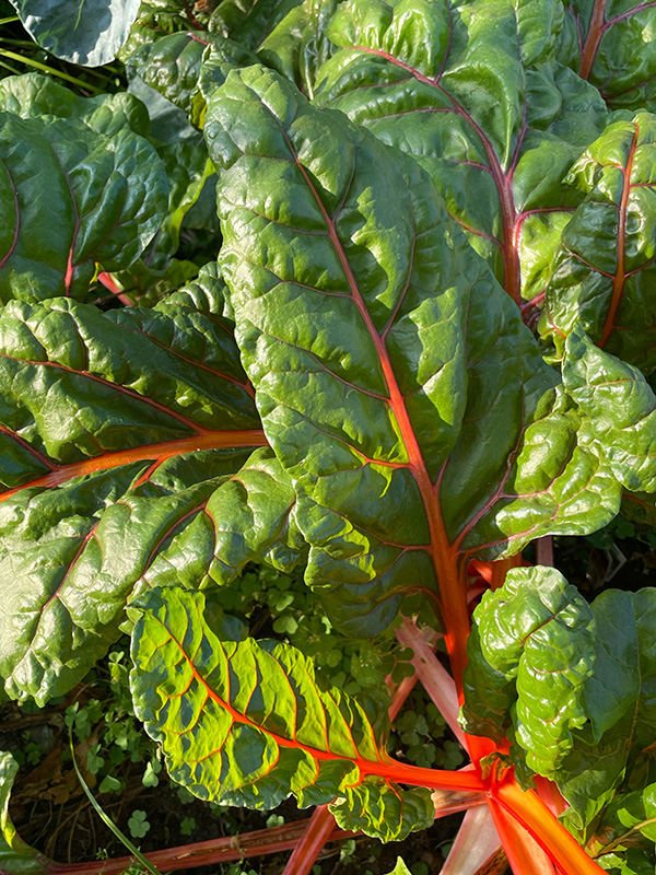 Bumpy, bright green leaves of rainbow chard with vivid crimson red stalks grow in the field.