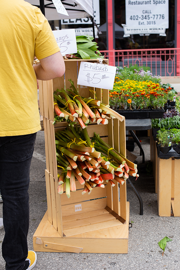 A customer in a yellow shirt stands next to a stack of brown wooden crates, full of bundles of vegetables.