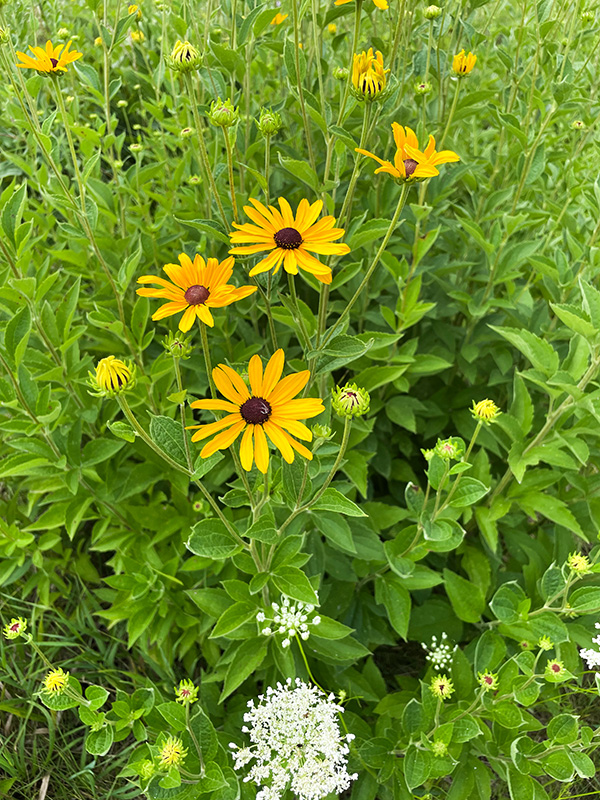 Close up view of Marigold in the foreground with space to see the landscape lush green view of the background.
