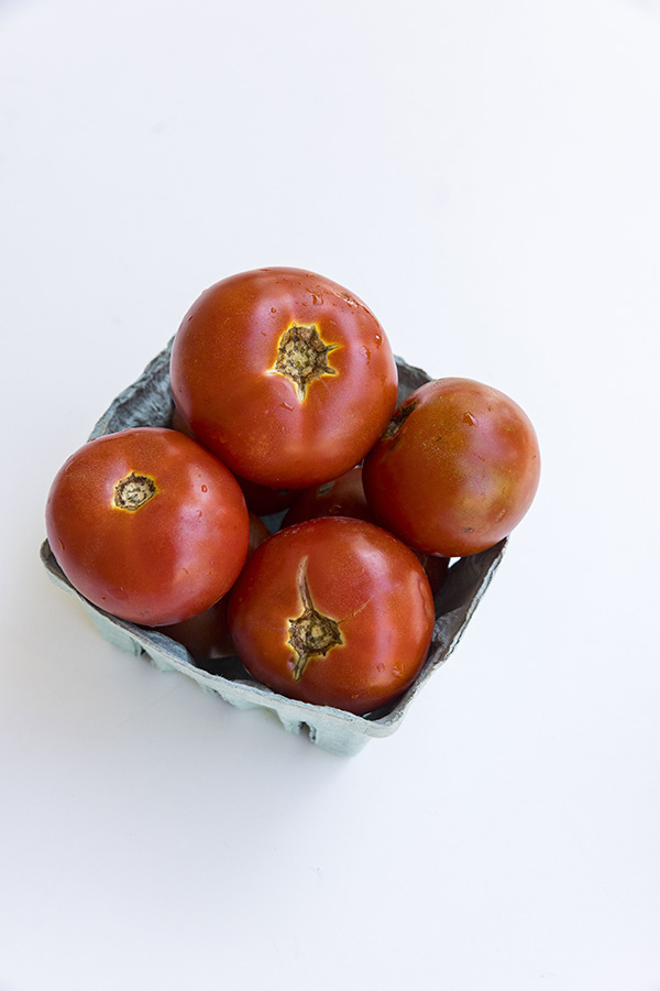 A container of slicer tomatoes on a white background.