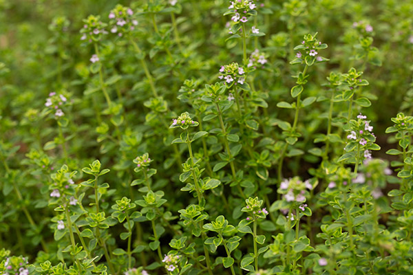 Numerous green stems of Lemon Thyme grow clusters of small, round, green leaves up each stem. Tiny lavender-pink flowers can