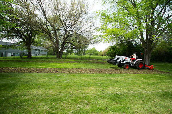 A farmer drives a small white tractor with a black bucket on the front. The tractor pulls a red rotary