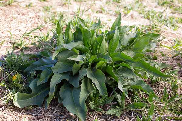 Terminated cover crops lay on the ground in the field where they were cut down. Some green plants remain growing