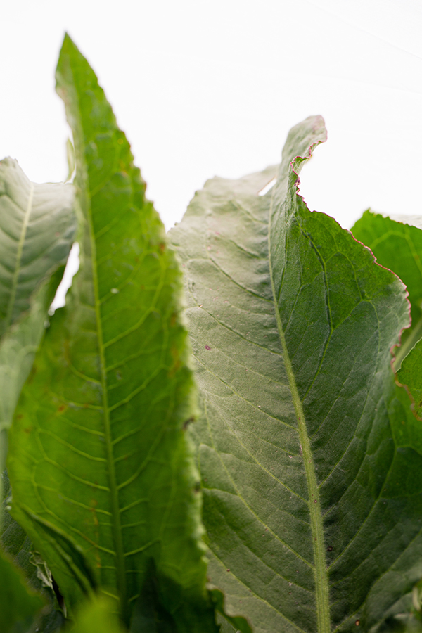 Slender green stalks of rye interspersed with the green compound leaves of hairy vetch, against a white background.